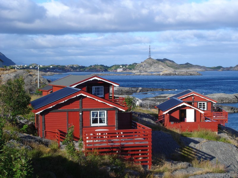 Moskenes mit einlaufender Fähre an einen regnerischen Nachmittag.
