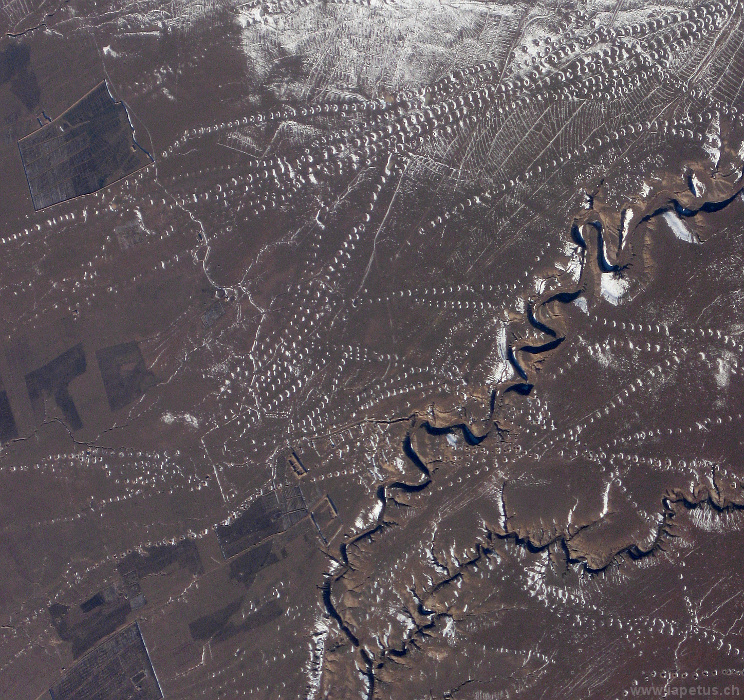 Karez (oder Qanat) in der Nähe von Shahjoy in Afghanistan. Karez sind horizontale Wassertunnel zur Verteilung von Frischwasser in ariden Gebieten. Die Lage der Tunnel ist anhand der periodisch an die Oberfläche führenden vertikalen Schächte zu erkennen.